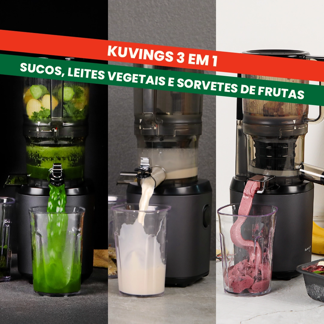 Transforme sua vida saudável com os extratores 3 em 1 da Kuvings: prepare sucos, leites vegetais e sorvetes em minutos!